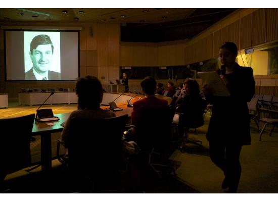 Al Solh presented a series of performances at the Ministry of Foreign Affairs exploring performance as a “live event” in the central conference room of the building, questioning the lecture/performance approach. and suddenly there were women consists of a fictitious-like and personal narrative about the specific context of the Ministry of Foreign Affairs and what it means to stage a performance there. Inspired by the central conference room, which serves as the forum for many international meetings at the Ministry, and the portraits of all the previous—and predominantly male—ministers of Foreign Affairs and Development Cooperations hanging at the entrance to this room, Al Solh asks herself about how to define and defend borders, based on Regis Debray's "L'eloge des frontieres", and the representation of men and women in politics in the Netherlands in relation and in contrast to the Arab world and to this particular space: the ministry of foreign affairs in The Hague.